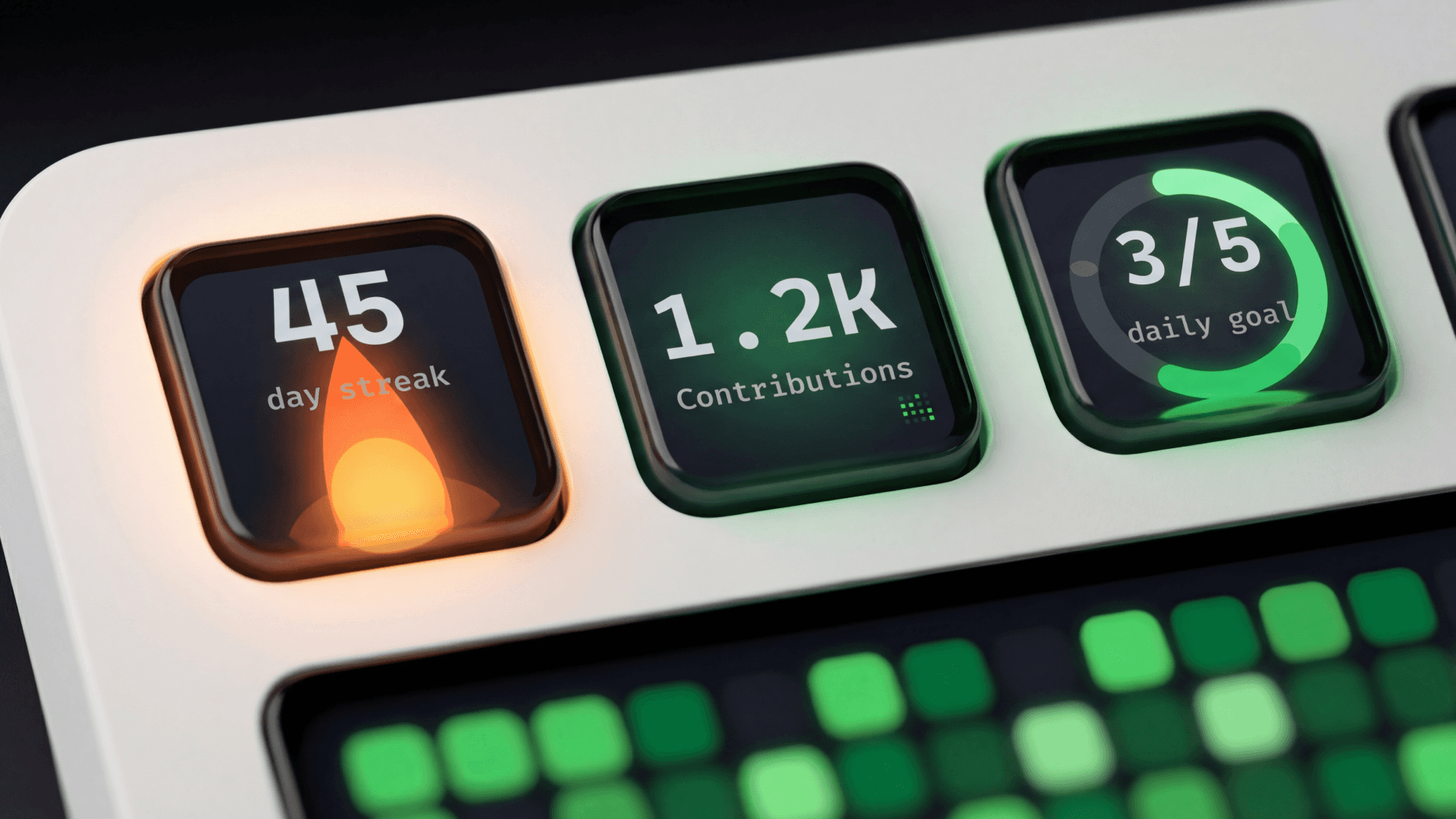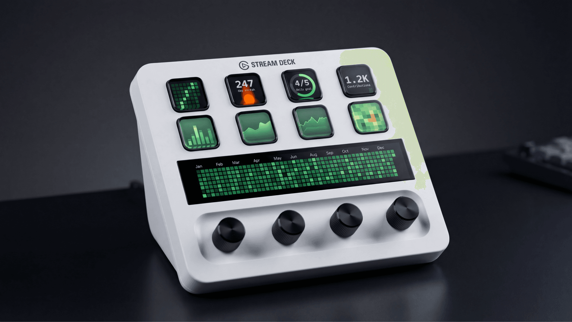 Full-width contribution graph (touch display, all 4 dials). Place Slots 1 through 4 left to right for an edge-to-edge view of your entire year. Slot 1 controls settings and the other three follow automatically. Rotate Slot 1 to change the year.